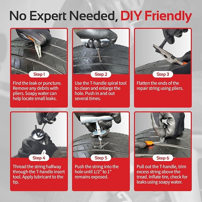 - [🧰Effortless Repairs with Convenient and Ergonomic Tools] Our tire repair tool kit features ergonomically designed tools with easy-grip T-handles that provide a nonslip experience. The result? An effortless tire repair process that gets you back on the road in record time. No experience? No problem! We have included a comprehensive instructions manual to guide you every step of the way.