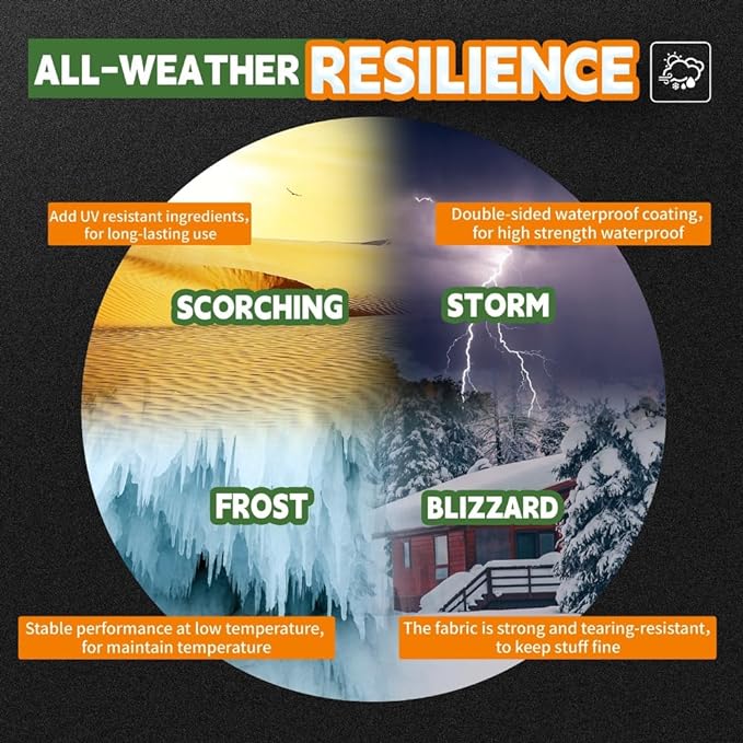 - 【UV RESISTANT TARP + WEATHER PROOF】Our tarp is designed to withstand outdoor use for extended periods due to UV anti-aging additives in the material. With a double-sided LDPE coating, it offers excellent water resistance. Count on us to be prepared for unpredictable