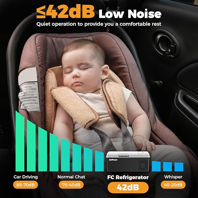 - Compact And Quiet:Setpower FC15 12 volt electric cooler has a compact capacity of 15.8 quart (15 Liter),can fit 20 cans 335ml Cola. This camping portable pefrigerator can serve you and your family enough food for 4-5 days trips. Due to its prefect mini size,you can place this portable fridge freezer anywhere ,money and space-saving. The noise test of this car portable fridge is below 42db to achieve silent operation, will not disturb your rest