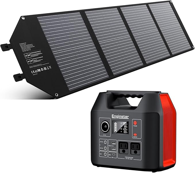 EnginStar Portable Power Station, 300W 296Wh Battery Bank with 110V Pure Sine Wave AC Outlet,100W Foldable Solar Panel Charger with 18V DC Outlet for Portable Power Stations