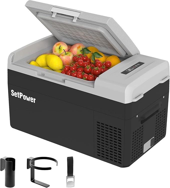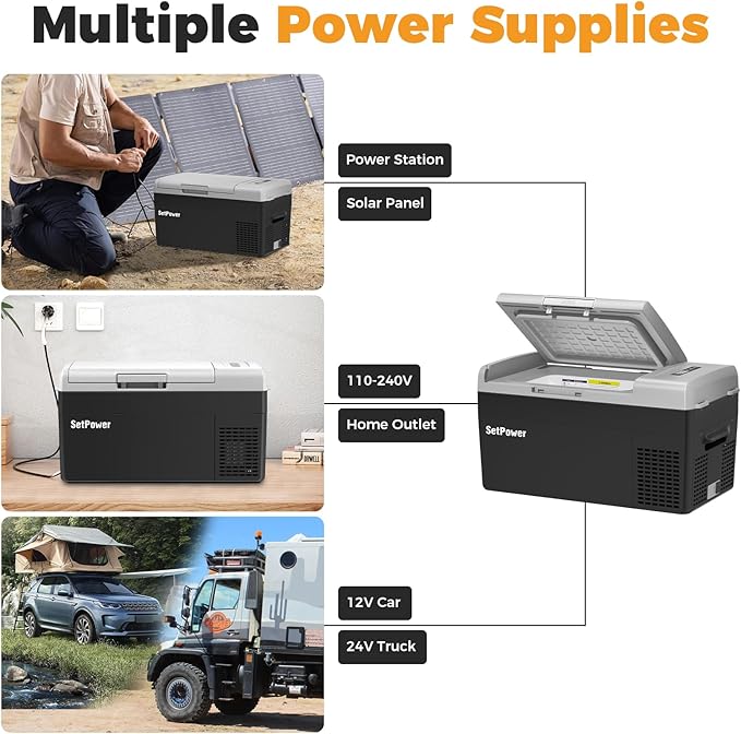 - Fast Cooling And Low Power Consumption: Equipped with strong variable frequency compressor, Setpower 12 volt refrigerator can achieve fast cooling from 77°F to 32°F within only 15 mins and reach the lowest -4℉ about an hour. Temperature range is -4℉ to -68℉. The average energy consumption of this portable fridge freezer is only 55W, keep food fresh, no ice needed anymore. This 12v car portable refrigerator is ideal for outdoor activity such as camping, travel, fishing, picnic, road trips