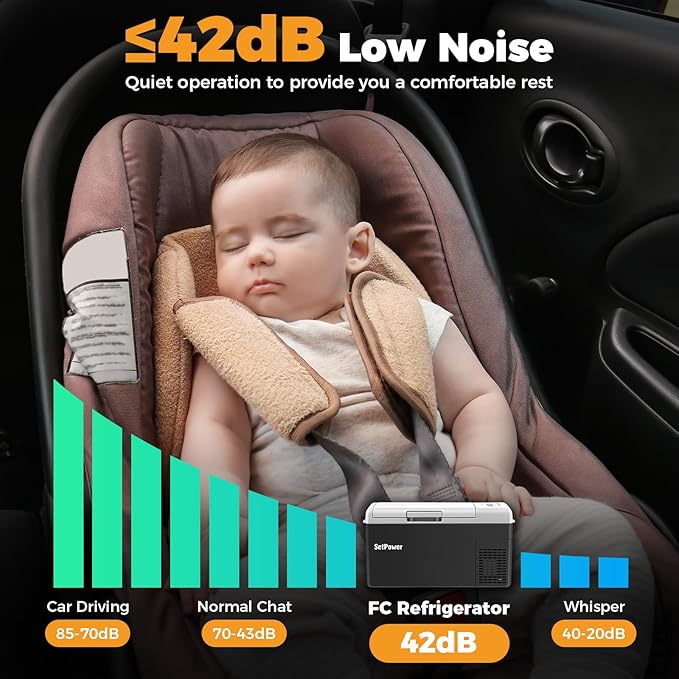 - Compact Capacity And 42dB Low Noise: Setpower FC20 12 volt electric cooler has a compact capacity of 21 quart (20 Liter), can fit 28 cans 335ml Cola. This camping portable pefrigerator can serve you and your family enough food for 4-5 days trips. Due to its mini size, you can place this portable fridge freezer anywhere , money and space-saving. The noise test of this car portable fridge is below 42db to achieve silent operation, will not disturb your rest