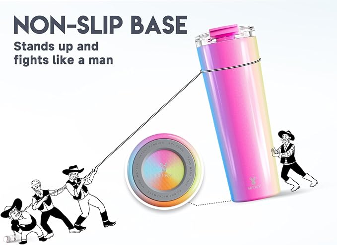 - NON-SLIP BASE. With non-slip base, Meoky travel coffee tumbler stands up and fights like a man.