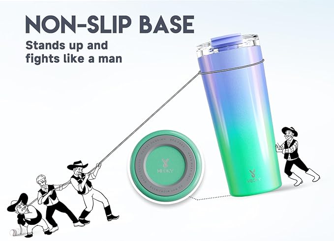 - NON-SLIP BASE. With non-slip base, Meoky travel coffee tumbler stands up and fights like a man.