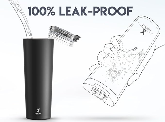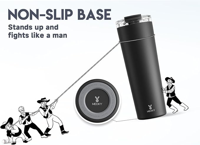 - NON-SLIP BASE. With non-slip base, Meoky travel coffee tumbler stands up and fights like a man.