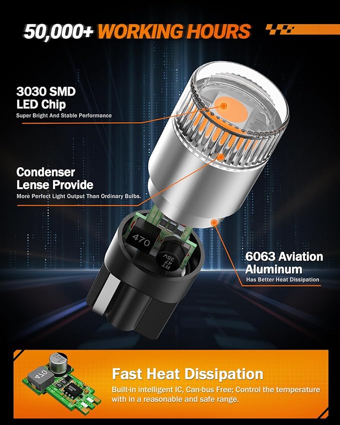 - 【1000% Brighter Than Halogen Bulb】 Sealight is equipped with a 3030 high-performance light bulb chip. Super bright amber & yellow light. 360 ° lighting angle, no dark spots, and huge brightness. Bring pure white and ultra bright light output to your car.