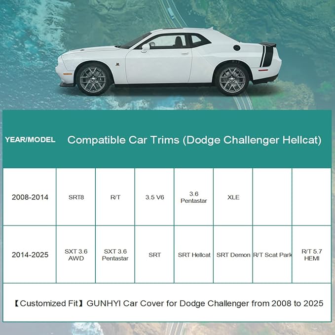 - 【Compatible with】This Full Car Cover Custom fit for Dodge Challenger Hellcat from 2008 to 2025. Comes with a microfiber towel that you can use to clean your car, because if there is sand on the surface of the car before use, it may damage the paint.