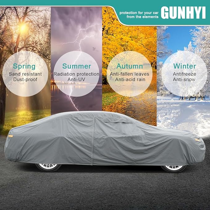 - 【Complete Protection】No matter hot sun or cold weather, GUNHYI all weather car covers can handle it all. The powerful material can effectively protect your car from sun, uv-rays, dust, snow, fallen leaves, industrial pollution, bird droppings, animals, acid rain and extreme weather, approved for use in all seasons.