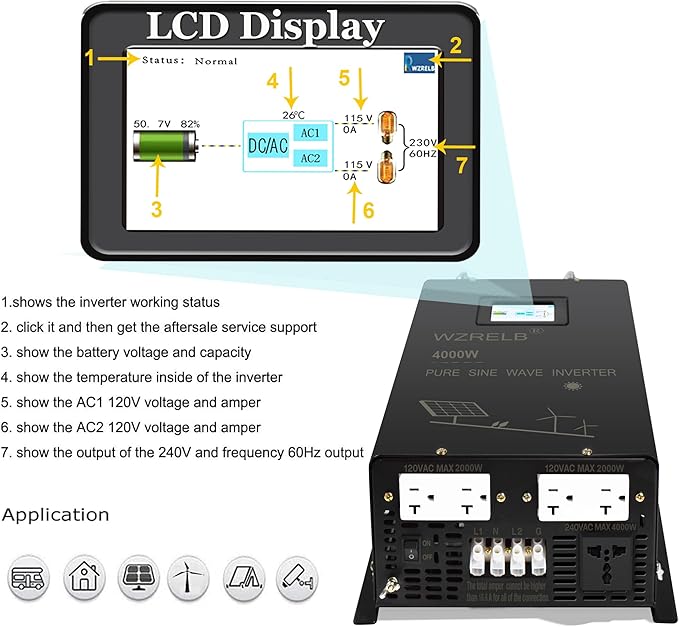 - LCD DISPLAY & REMOTE CONTROLLER: Easily access to running parameters with battery status, working temperature, 120V 240V output voltage status,etc,Keep track of the working stutas in real time ,allow to switch the inverter ON/OFF remotely within 100ft in room and 150ft in open area for distant operation without leaving your cozy zone