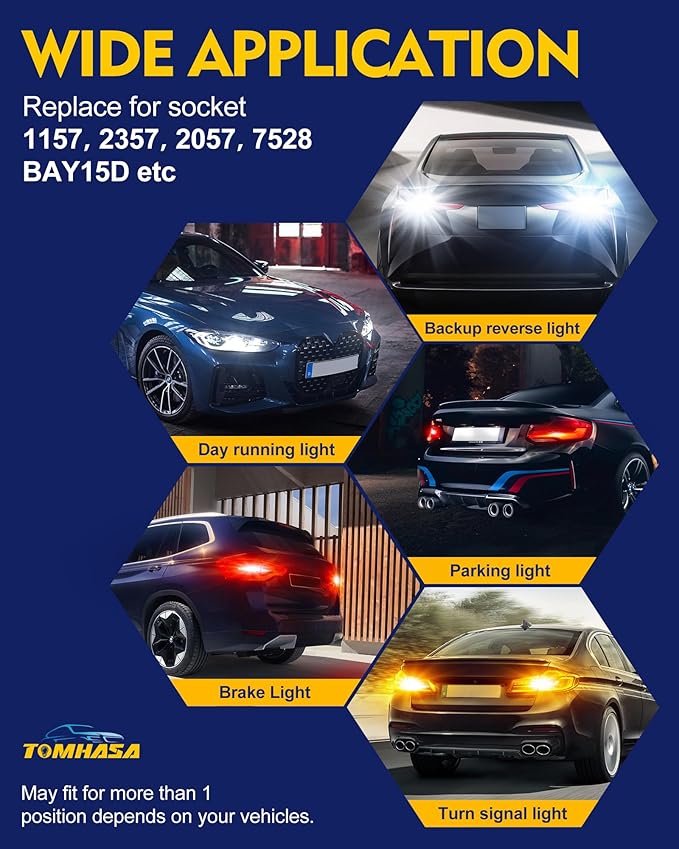 - 【Fitment】 These LED bulbs are just replaced for 1157 1016 1034 1157A 2057 2057A 2357 2357A 2357NA BAY15D 2397 3496 7528 p21/5w sockets ect. Please double check your vehicles owner’s manual or the original bulb to confirm the correct light size you need before placing the order
