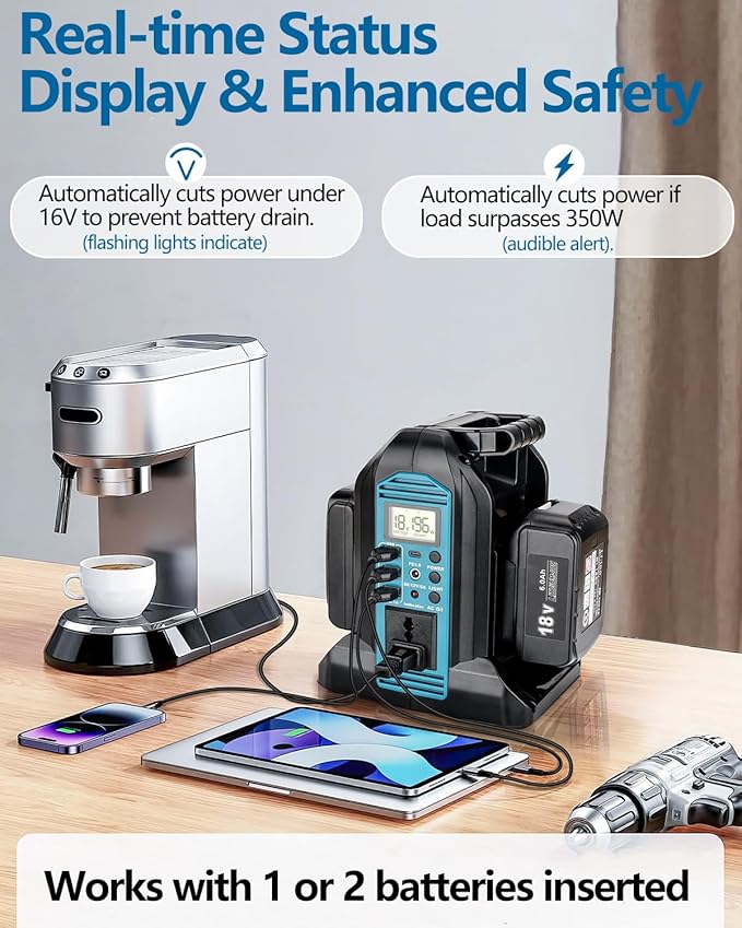 - ⚡350W 2-Ports Power Inverter: Perfect Compatible with Makita 18V lithium-ion batteries BL1815B BL1820B BL1830B BL1835B BL1840B BL1845B BL1850B BL1860B etc.(Battery not included)