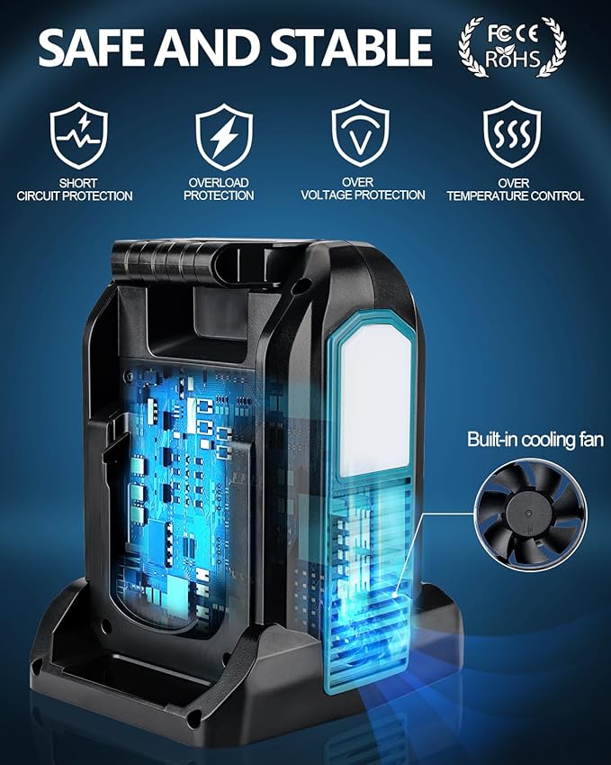- ⚡Safety and Stability: Built-in smart chip, 18V to 110V battery power inverter automatically provides multiple protections. FCC, CE, ROHS certified. Protects your Makita 18v battery from overcurrent, overvoltage, overheating, overload and short circuit. Provides full protection during use.