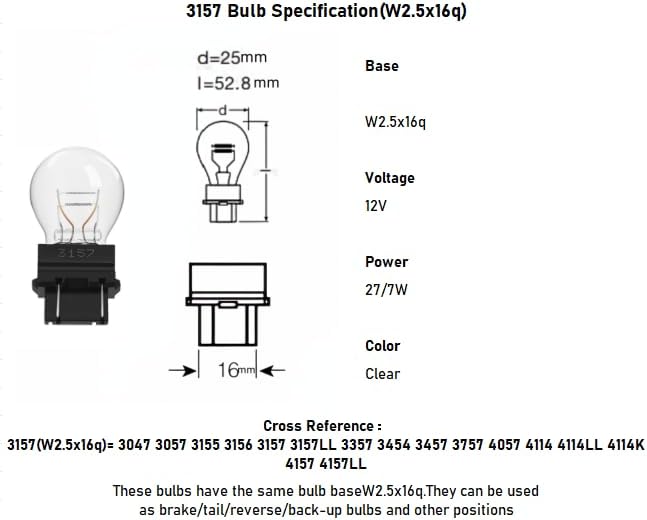 - Cross Reference T25 P27/7W, 3157,3157LL,3157K,3157a,3157all,3157ak,3157na,3157nall,3157nak,3157r,3047 3057 3457,3457ll,3457k,3457a,3457all,3457ak,3457na,3457nak 3757 4057 4114 4114LL 4114K 4157 4157LL