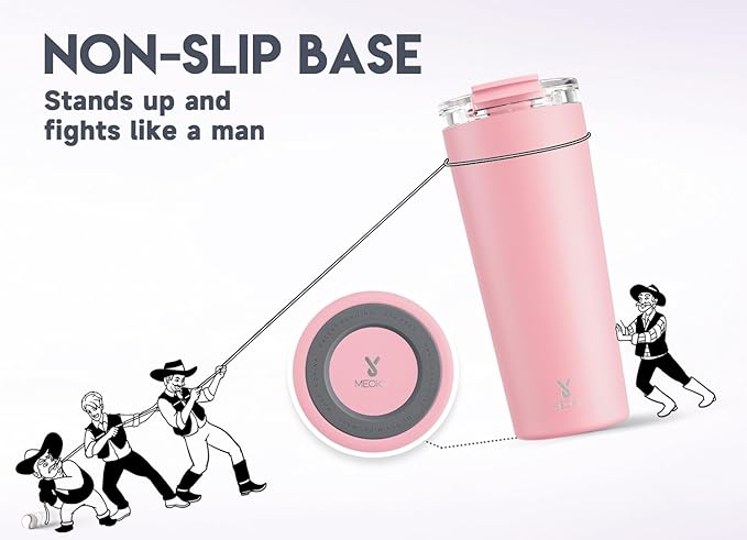 - NON-SLIP BASE. With non-slip base, Meoky travel coffee tumbler stands up and fights like a man.