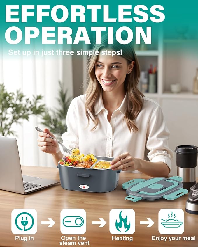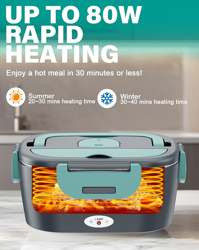 - 80W FAST HEATING: Our heated lunch box delivers quick and even heating, warming your meals in just 20-40 minutes depending on the ambient temperature and food type. For frozen or dry items, simply add a splash of water to accelerate the warming process