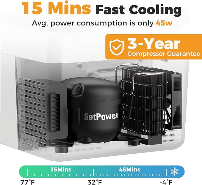 - Fast Cooling And Low Power Consumption: Equipped with strong variable frequency compressor, Setpower Electric Coolers can achieve fast cooling from 77°F to 32°F within only 15 minutes and reach the lowest -4℉ in about an hour. Temperature range is -4℉ to 68℉. The average energy consumption of this car refrigerator is only 45W to keep food fresh, no ice needed anymore