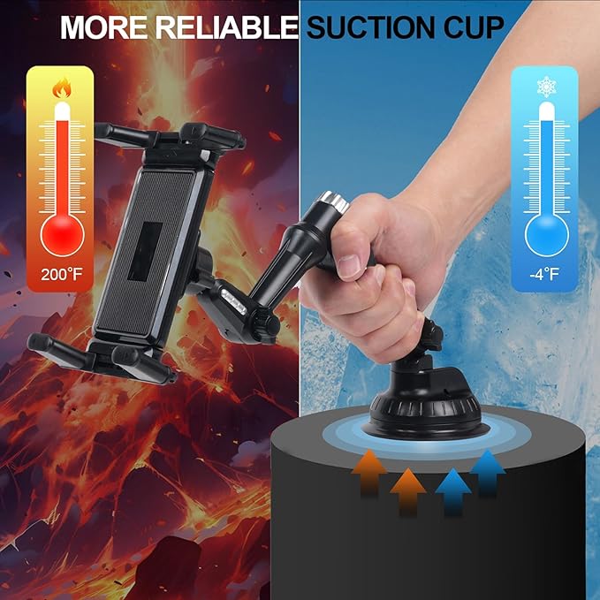- Strong Suction Cup : The phone holder mount is equipped with non-slip rubber pads and heat-resistant material, which can adhere firmly to the dashboard and windshield and keep the mount stable in any conditions. To restore adhesion, simply rinse the sticky surface with warm water and wipe dry.