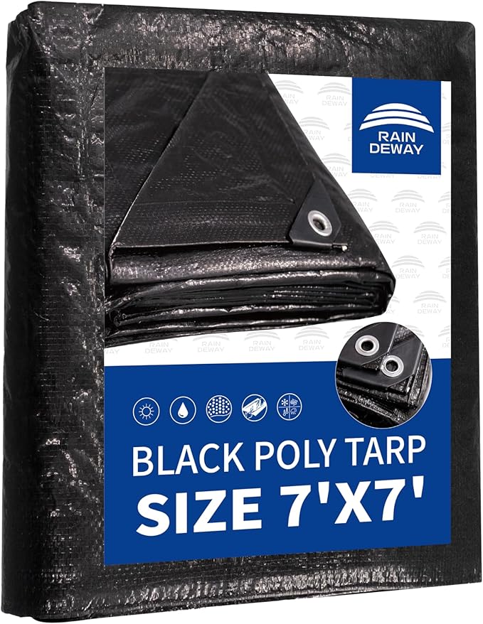 RAINDEWAY Black Tarps 7x7 Feet,UV Resistant, Multipurpose Medium Duty Waterproof Poly Tarp, Square Tent Tarp,Cover with Metal Grommets and Reinforced Edges, Finished Size