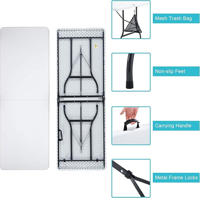 VECELO 6Ft Folding Table,Indoor Outdoor Portable Picnic Plastic Table with Mesh Trash Bag,Heavy Duty Foldable Camp Desk with Handle Legs for Dining Wedding&Party,Pearl White