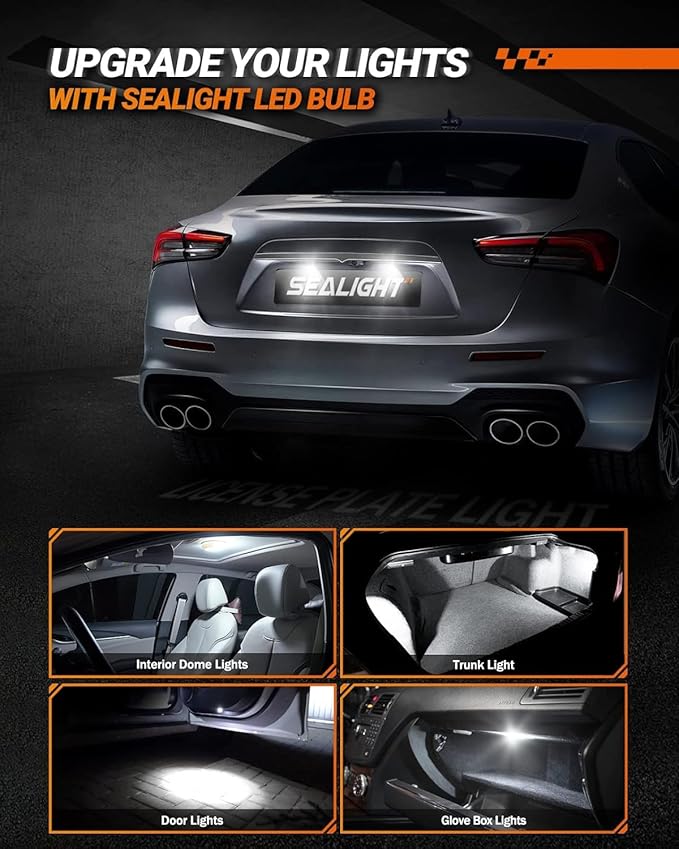 - 【1000% Brighter Than Halogen Bulb】 Sealight is equipped with a 3030 high-performance light bulb chip. 6000K super bright white light. 360 ° lighting angle, no dark spots, and huge brightness. Bring pure white and ultra bright light output to your car.