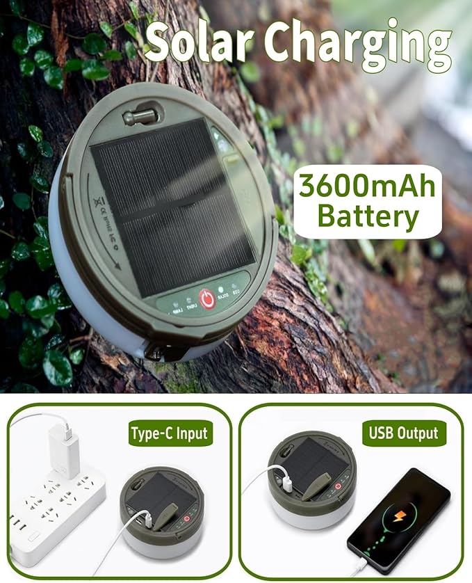 - đăSolar & USB Rechargeableă- With a built-in 3600mAh battery, our Solar Camping Lights charge in just 8 hours under the sun or 4 hours via USB-C cable. Get up to 8 hours of full brightness or a whopping 18 hours at minimum brightness for extended outdoor use.
