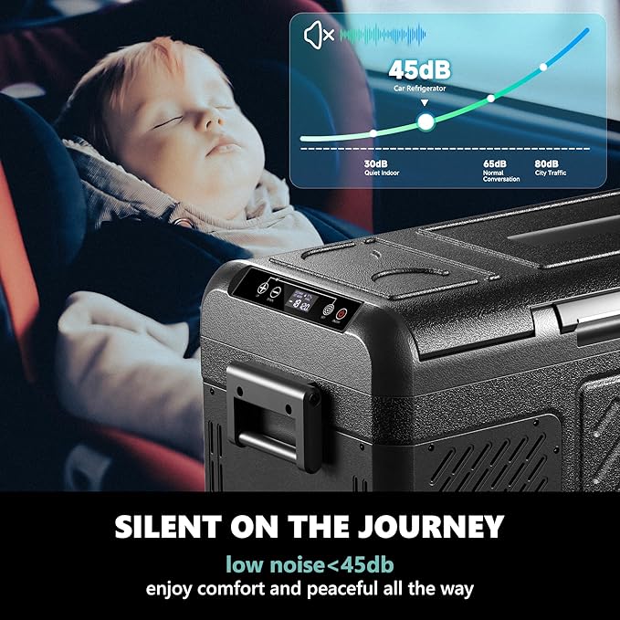 - Reversible Door & LCD Panel; The LED panel on the 12v fridge is easy to operate, with clear buttons for adjusting the temperature range at any time. Our 12v cooler features a reversible, removable door design, allowing you to open it from either side as needed. The built-in LED light in the 12 volt cooler ensures easy access to your food even at night, and the silent design provides a comfortable, quiet environment