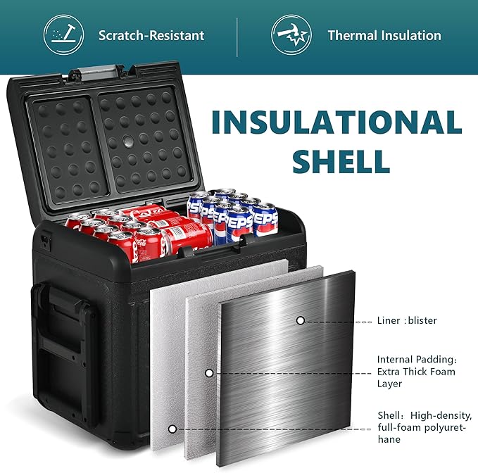 - Humanized Design & Portable Design; The electric cooler for camping features reinforced handles and off-road wheels, making it easy to transport. The user-friendly LED panel with clear buttons allows you to adjust the temperature range at any time. This 12 volt cooler is designed with shock-resistant technology, ensuring it functions properly even on rough slopes up to 40 degrees