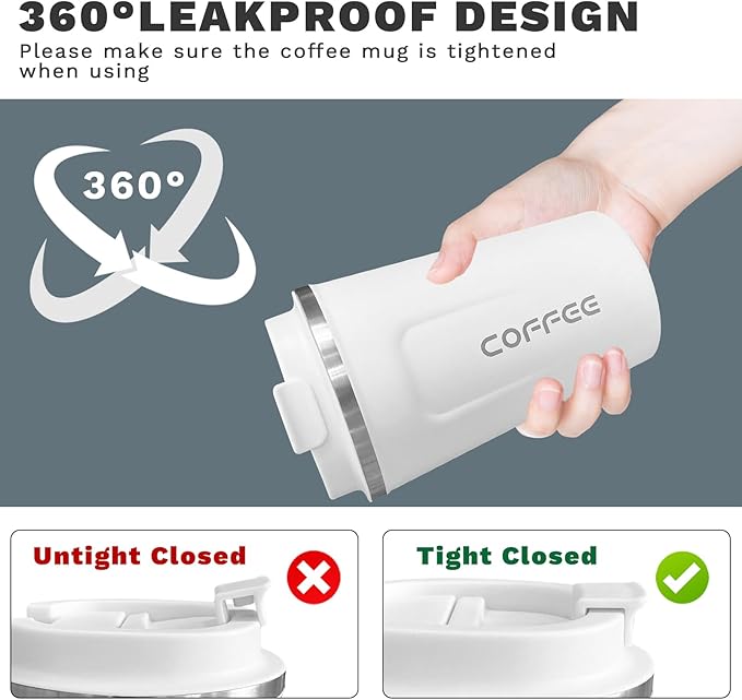 - Leakproof and Spill-proof: The stainless steel coffee mug comes with a screw-on sealed lid that ensures your drink won’t spill if it’s tipped over or stored in a bag. The lid features a sealing ring for extra leak resistance and is easy to screw on and off. The drinking spout on top makes sipping convenient whether you’re at home, at work, or on the go.