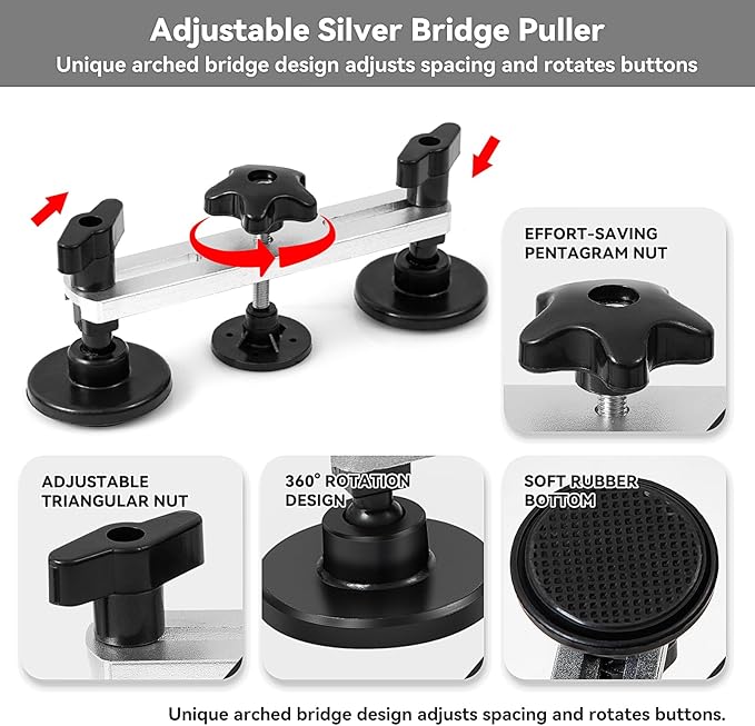 - OUTSTANDING CUSTOMER SERVICE - ① 30-day money-back guarantee for any reason. ② 24-month warranty for quality-related issues. ③ We provide up to 20 free accessory replacements for your dent pulling kit within the warranty period. In addition, the dent puller tool can be used for unlimited time. If you have any questions about our car dent remover puller, please make sure to tell us first, and we will provide satisfactory solutions. Thanks for choosing our dent kit.
