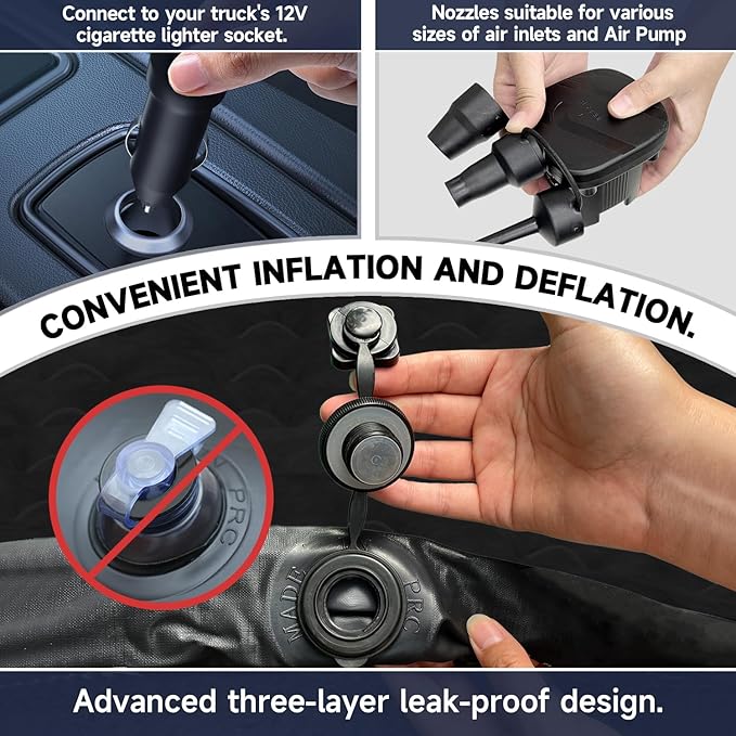 - Clever T-Shaped Design: The innovative T-shaped design of the pickup truck air mattress perfectly matches the dimensions of the truck bed, maximizing space while meeting needs and providing a more stable and comfortable user experience. Additionally, the surface and bottom of the mattress are made of non-slip material, ensuring that users do not slide while sleeping, enhancing safety and stability during use.