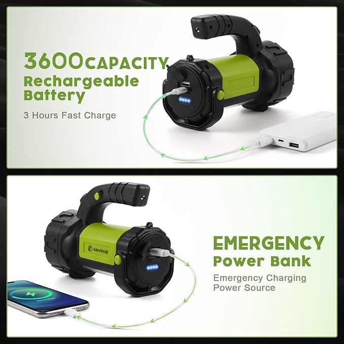 - WITH 3600 CAPACITY RECHARGEABLE BATTERY: The emergency light built-in rechargeable battery has a life span of up to 50,000 hours. It can be fully charged in 3 hours, and it can work continuously for 12 hours outdoors. You can also charge your mobile phone in emergency