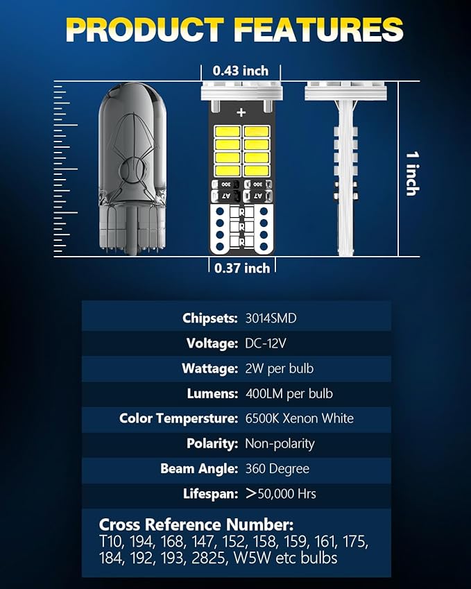 - 【97% Vehicle Compatibility】: Compatible with multiple LED bulb models including T10, 194, 168, 147, 152, 158, 159, 161, 175, 184, 192, 193, 2825, W5W. Suitable for various vehicle positions such as license plate lights, car interior door lights, RV interior lights, dome lights, parking lights, side marker lights, trunk lights, courtesy lights, map lights, glove box lights, and more, offering a bright upgrade to refresh your car's appearance.