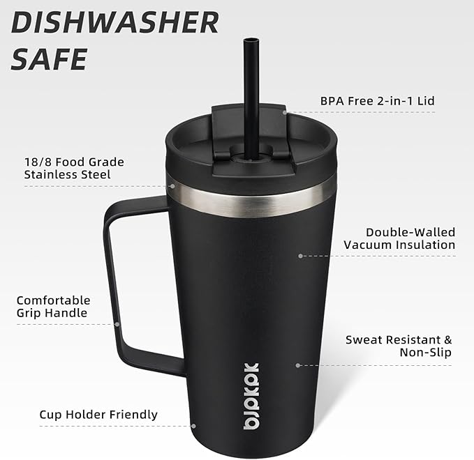 BJPKPK Insulated Tumbler with Handle, 18oz Insulated Tumblers with Lid and Straw, Stainless Steel Metal Water Bottles, Coffee Travel Mugs, Cups, Black