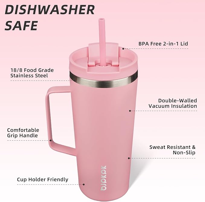 BJPKPK Insulated Tumbler with Handle, 22oz Insulated Tumblers with Lid and Straw, Stainless Steel Metal Water Bottles, Coffee Travel Mugs, Cups, Light Pink