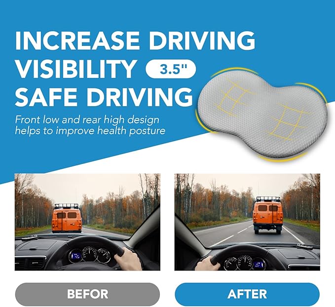 - IMPROVED VISIBILITY & PAIN RELIEF: This seat cushion for car seat driver not only raises your position for improved sight and safer driving, but it also provides spinal protection and pain relief. By reducing pressure on the coccyx and sacrum, it helps alleviate lower back pain and sciatica, promoting a more comfortable and pain-free driving experience