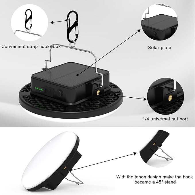 - 🌞【Solar Plate】The back is equipped with a solar panel, which allows you to easily respond to any emergency situation. Simply expose yourself to the sun and charge the camping lights