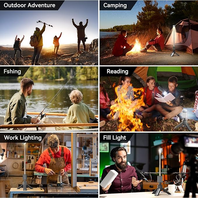 - Portable and Easy to Use: Featuring a retractable, foldable, and magnetic tripod design, our camping light is incredibly easy to carry and store, ideal for limited space in camping backpacks. The extendable lamp pole can illuminate hard-to-reach areas like tent tops or narrow corners. The tripod can stand stably on flat ground, grass, or sand, and the built-in magnet allows it to attach securely to cars, boats, or motorcycles