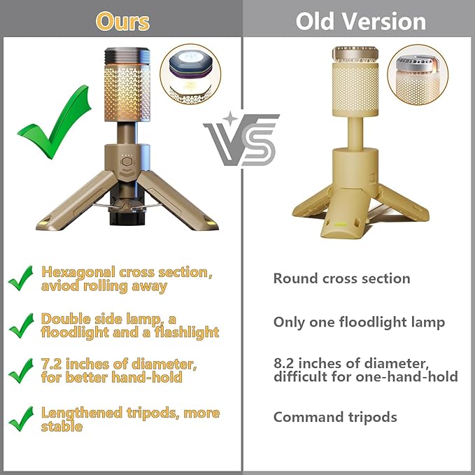 - NEW DESIGNED LAMP SHADE: With a large Angle lighting design and a lighting Angle is up to 240°, this camping lantern has a much larger lighting range than its competitors, bringing you more safety and convenience. This telescoping camping light features a retractable pole and foldable tripod base, which you can freely adjust as needed. Meanwhile, it uses a regular hexagonal cross-section design, placed on the slope of the ground will not cause trouble due to rolling.