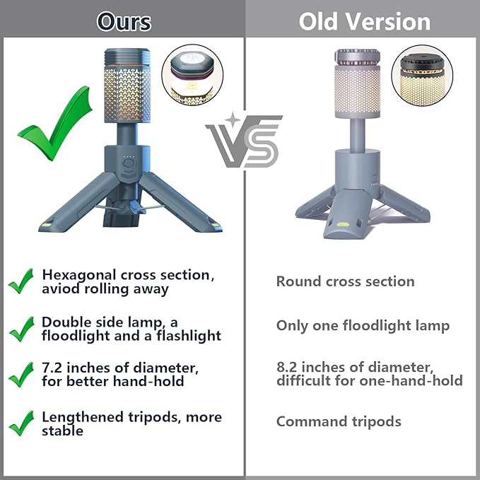 - NEW DESIGNED LAMP SHADE: With a large Angle lighting design and a lighting Angle is up to 240°, this camping lantern has a much larger lighting range than its competitors, bringing you more safety and convenience. This telescoping camping light features a retractable pole and foldable tripod base, which you can freely adjust as needed. Meanwhile, it uses a regular hexagonal cross-section design, placed on the slope of the ground will not cause trouble due to rolling