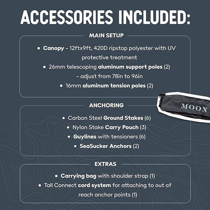 - DOUBLE THE SHADE: MoonShade XL is our largest portable vehicle awning with 12ft x 9ft of coverage. Provides reliable shade and rain protection to keep you comfortable outdoors.