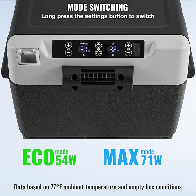 - Quiet & Energy Efficient: The fridge operates with noise ≤ 45dB, ensuring you sleep well after long drives. You can also choose between ECO and Max modes via the LCD touchscreen. In ECO energy-saving mode, the operating power of this portable fridge is less than 54W. Even when running in MAX mode (71W), its intelligent circulation consumes less than 0.33 kWh/day.