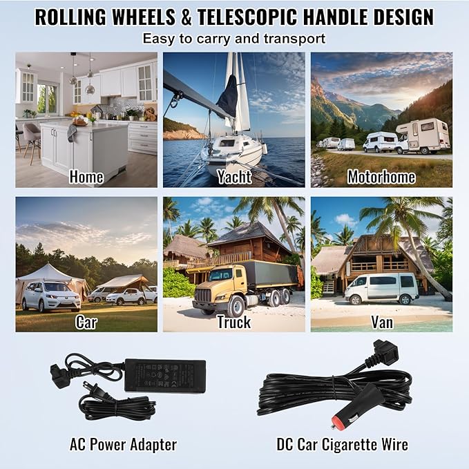 - Dual Use for Home/Car: Designed with sturdy wheels and a telescopic handle for effortless and stable transportation. Additionally, the car fridge is equipped with 110/240V AC and 12/24V DC adapters, making it suitable for use at home, on yachts, RVs, cars, trucks, and vans.