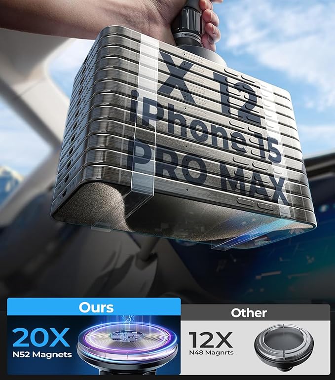 - 【Strong Magnetic Grip】Equipped with 20 powerful N52-grade neodymium magnets, this mount delivers a secure hold, even on rough roads. With magnetic forces of up to 12N for the iPhone 13-15 series, 15N for MagSafe cases, and 25N for metal rings, your device remains firmly in place, ensuring a safe and stress-free drive.