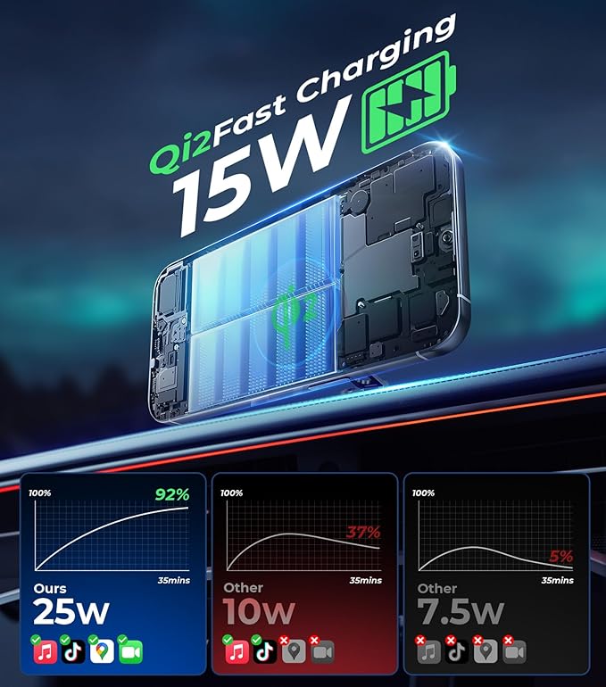 - 【⚡ Qi2 Certified IntelliCharge | Official-Grade Speed | No More Waiting or Overheating】 Leading the charge with the Qi2 IntelliCharge Wireless Charging Module. Officially Qi2 certified(Qi2-ID:20799), it provides charging efficiency and intelligent thermal management vs Apple‘s official MagSafe.The innovative CoolRing ventilation system reduces charging temperature by 15°C for stable, long-duration charging. Use an 18W+ QC adapter (sold separately) to activate maximum charging speed, powering your iPhone 16/15 to 50% in just 35 minutes. Effortlessly snap your phone into place with one hand—no cords, no damaged ports, no messy cables. Enjoy safer, hassle-free charging on the road.