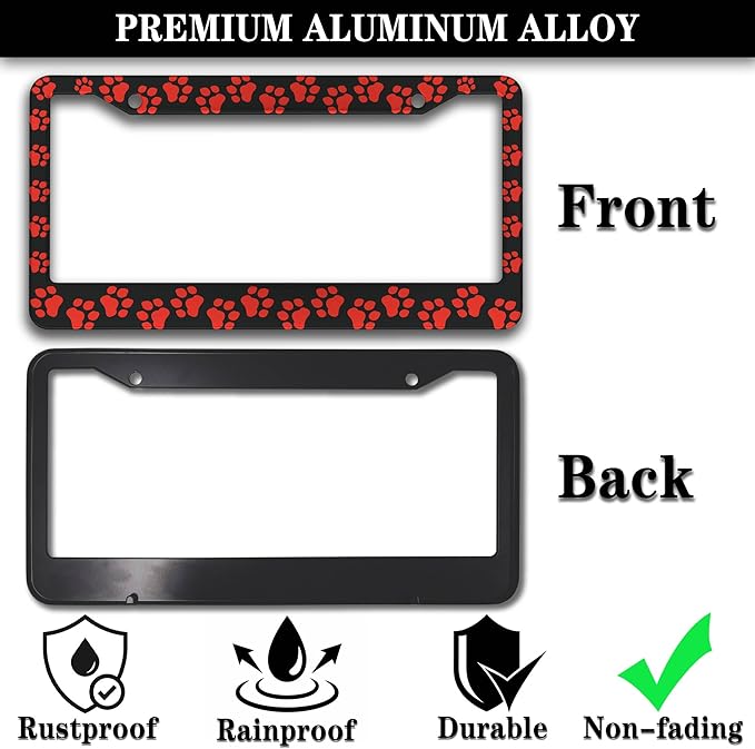 Custom License Plate Frame Black and Red License Plate Frames Animal Dog Paw Aluminum Metal Car Accessory 2 Pack with Screw Covers Set