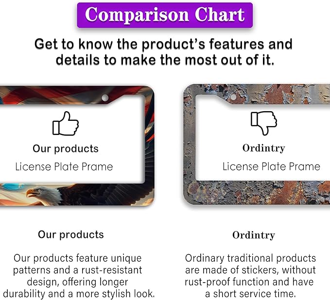 - ALUMINUM FRAME: This License Plate Frame is crafted from high-quality aluminum that is resistant to corrosion, rust, and harsh weather conditions. Its rugged reliability design ensures a long lifespan, making it capable of withstanding car washes and extreme weather, providing you with a reliable and stylish solution for your vehicle.