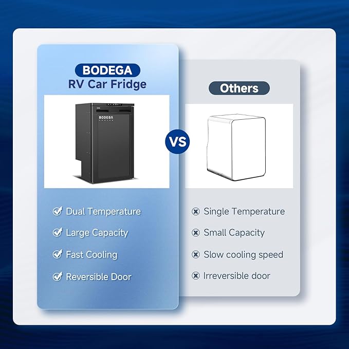 - Dual Zone & APP Control: BODEGA 12Volt RV refrigerator supports manual control or WiFi APP control. Dual zones allow for both freezing and refrigeration. You can check or set the temperature, voltage, cooling mode, and more using the APP