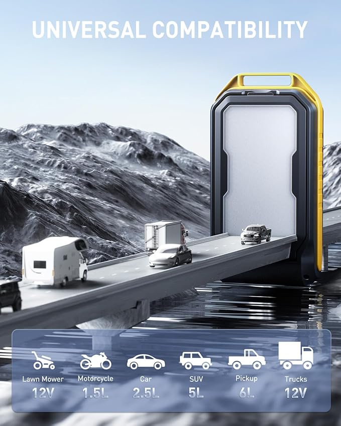 - ➤【Powerful Jump Starter】AUXITO portable jump starter with up to 6000A peak current and the latest QDSP technology, instantly starts 12V vehicles (up to 10.5L gas/10L diesel) even in extreme weather from -4°F to 140°F. A single charge can start 50 times, suitable for cars, trucks, motorbikes, boats, RVs, or tractors