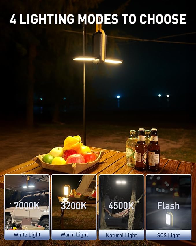- ➤【Hangable Camping Light】Ultra-bright 4000 lumen LED dual panel light is angle adjustable to provide 360° illumination that lasts for 24 hours! With four lighting modes (cool white, warm yellow, yellow-white and strobe), works as camping light/work light/reading light