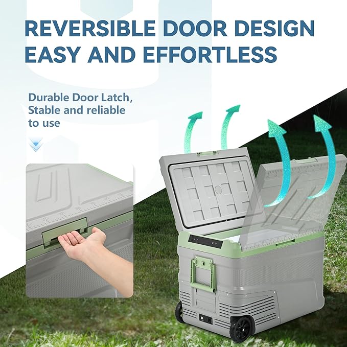 - User-friendly Design and Quiet Operation: The 12 volt cooler is equipped with a simple LCD control panel for easy temperature adjustment. And with a temperature memory function, restarting after power failure will retain the previous preset temperature. The reversible door is designed with a ruler, which can facilitate you to measure the size of various items. The car cooler operates at only 45 decibels and adopts a shockproof design, which can run smoothly on rugged slopes up to 45 degrees, giving you peace of mind on the road.